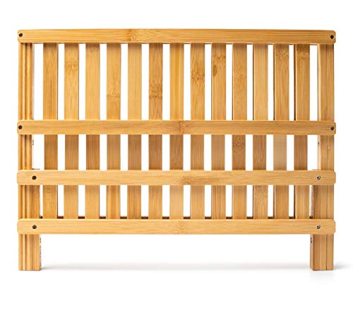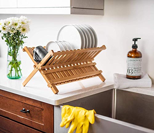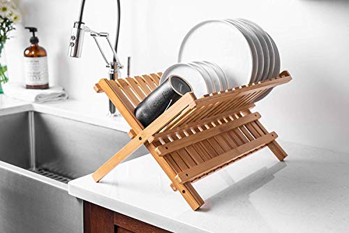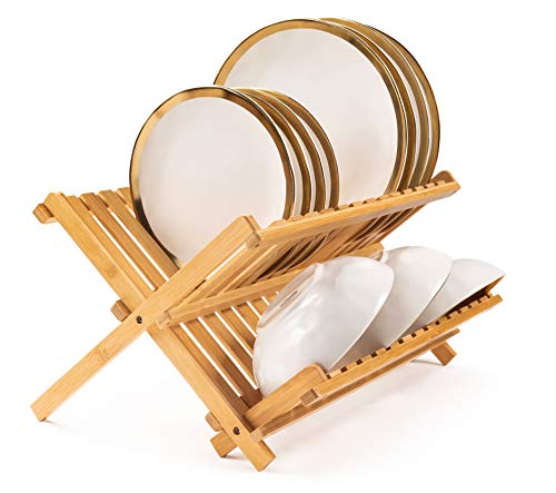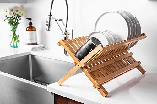 AIR-DRY A FULL DINNER SERVICE: Un-dried dishes eat up counter area. But set them on the Bellemain folding bamboo dish drying rack to air dry, and you’ll suddenly find a lot more space. Up to 14 plates and up to 10 glasses, mugs and cups can fit easily, and stylishly. Measures 18″ inches by 13″ inches by 10.5″ inches.